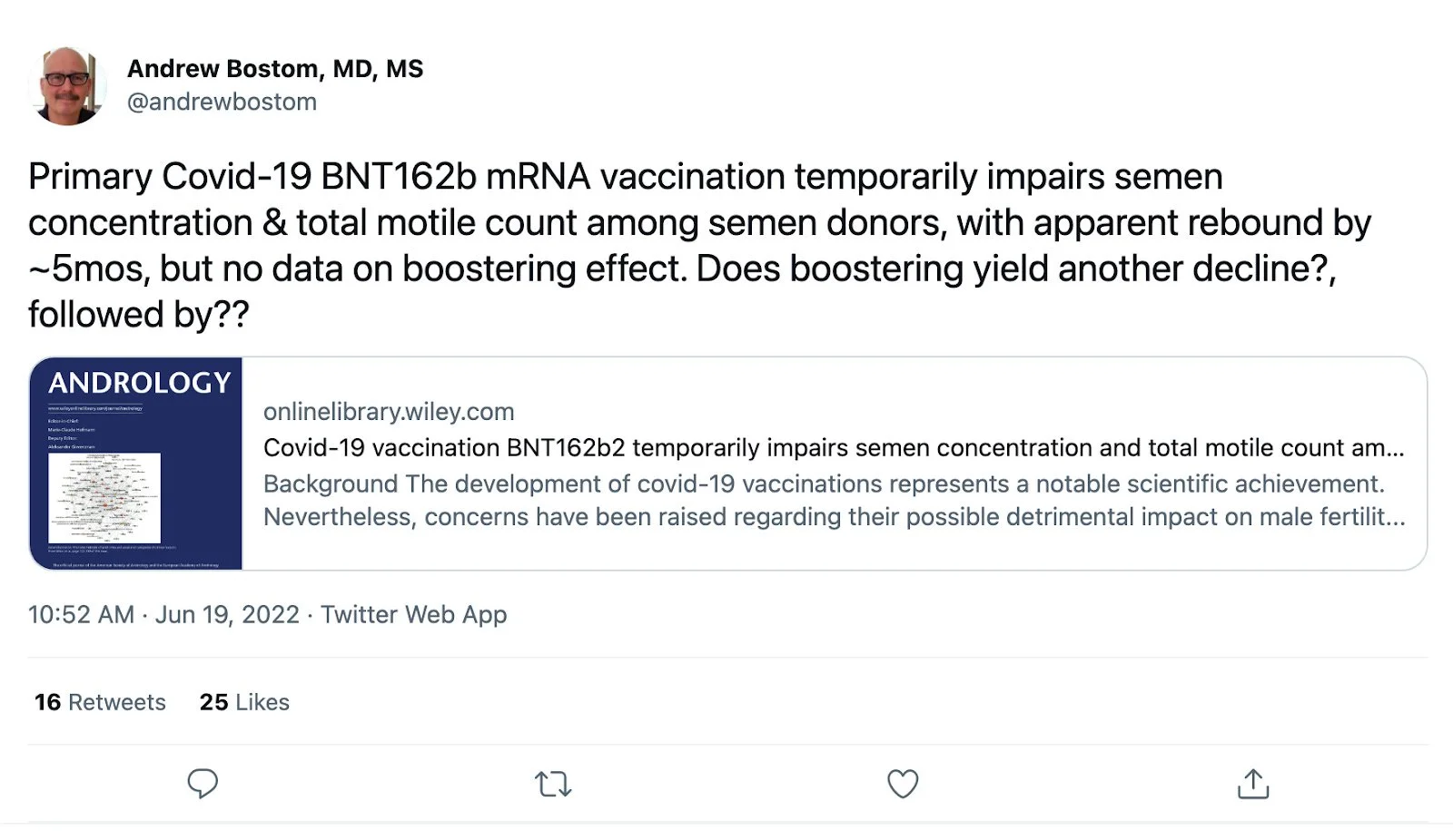 Andrew Bostom, a Rhode Island physician, was permanently suspended from Twitter after receiving multiple strikes for misinformation. One of his strikes was for a tweet referencing the results from a peer-reviewed study that found a deterioration in sperm concentration and total motile count in sperm donors following mRNA vaccination.