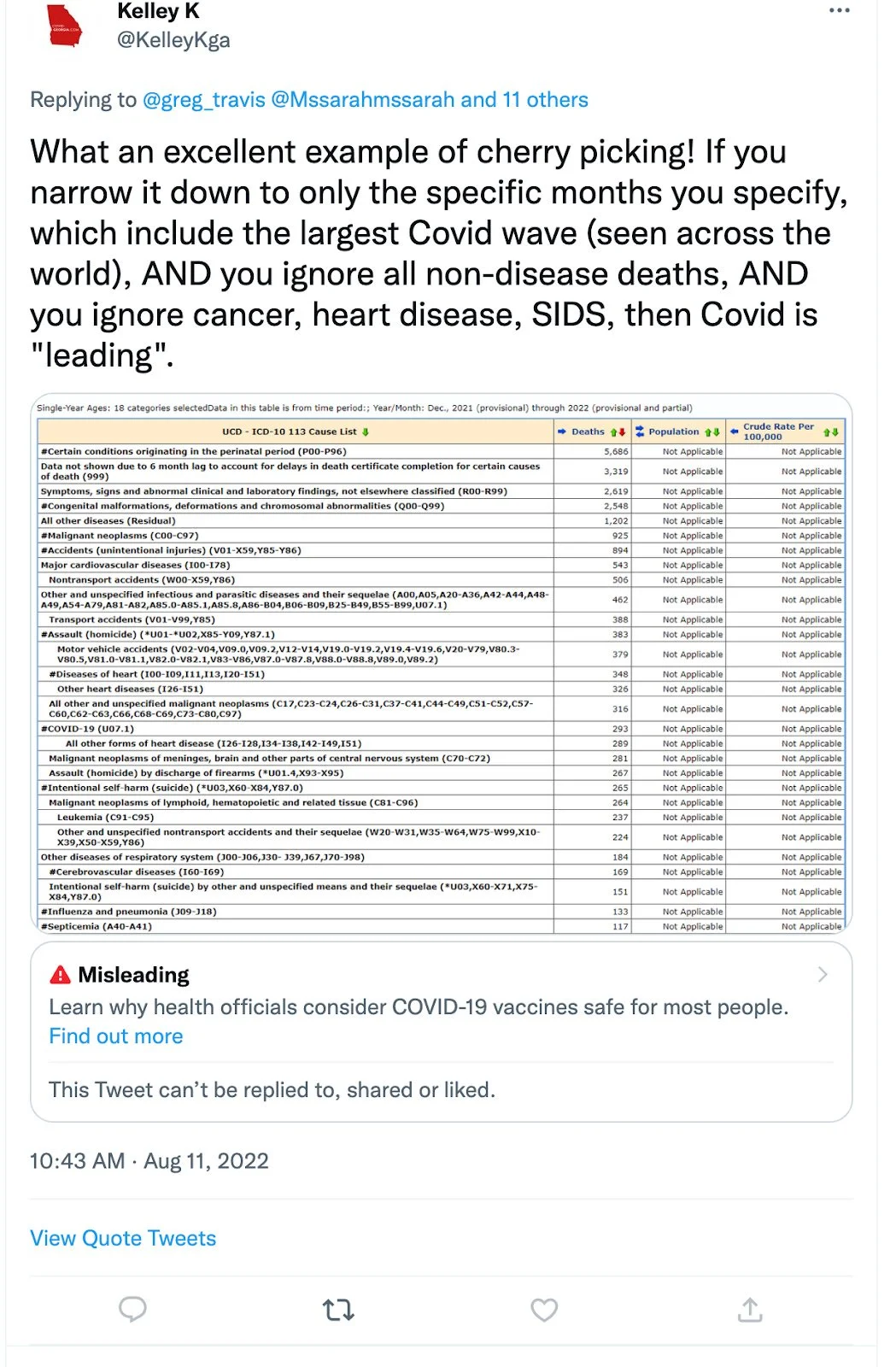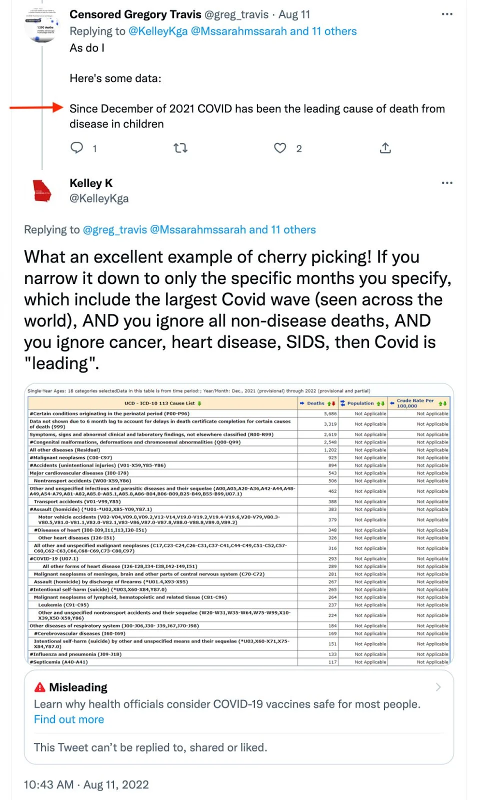 For example, a tweet by @KelleyKga, a self-proclaimed public health fact checker with more than 18,000 followers, was flagged as “misleading,” and replies and likes disabled, for showing that Covid was not the leading cause of death in children, even though it cited the CDC’s own data.