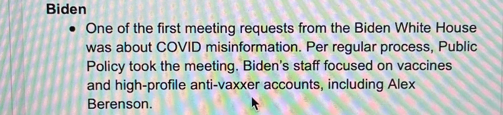 By the summer of 2021, the day after Murthy’s memo, Biden announced publicly that social media companies were “killing people” by allowing misinformation about vaccines. Just hours later, Twitter locked Berenson out of his account, and then permanently suspended him the next month. Berenson sued Twitter. He ultimately settled with the company, and is now back on the platform. As part of the lawsuit, Twitter was compelled to provide certain internal communications. They revealed that the White House had directly met with Twitter employees and pressured them to take action on Berenson.