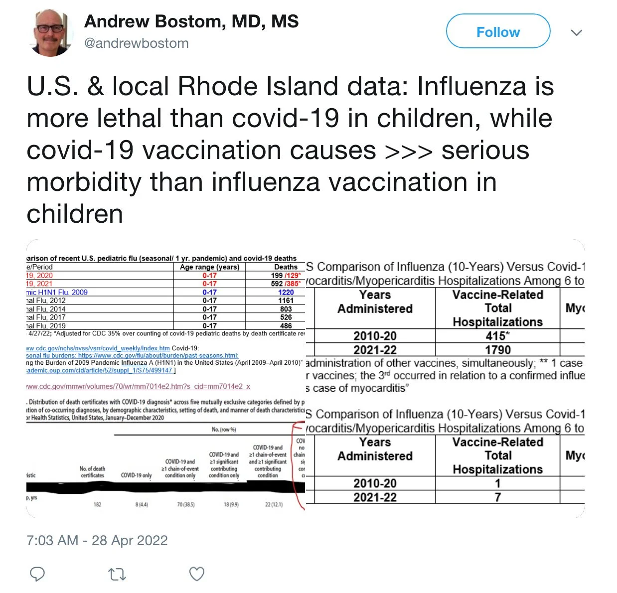 The one Bostom tweet found to still be in violation of Twitter policy cited data and drew a conclusion that was totally legitimate. The problem was only that it was inconvenient to the public health establishment’s narrative about the relative risks of flu versus Covid in children.