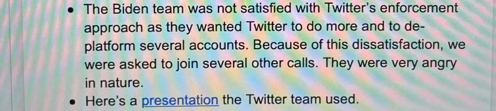 Culbertson wrote that the Biden team was “very angry” that Twitter had not been more aggressive in deplatforming multiple accounts. They wanted Twitter to do more.