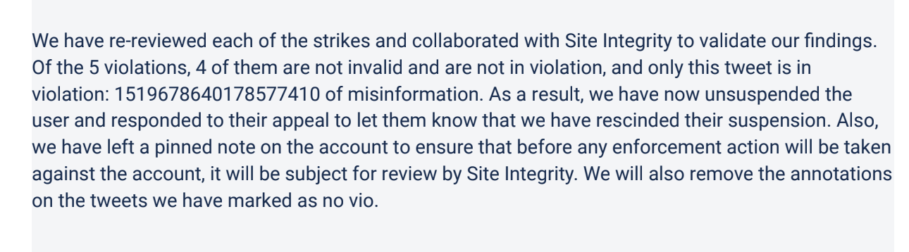 Third: Most importantly, the buck stopped with higher level employees at Twitter. They chose the inputs for the bots and decision trees. They determined suspensions. And as is the case with all people and institutions, there was both individual and collective bias.