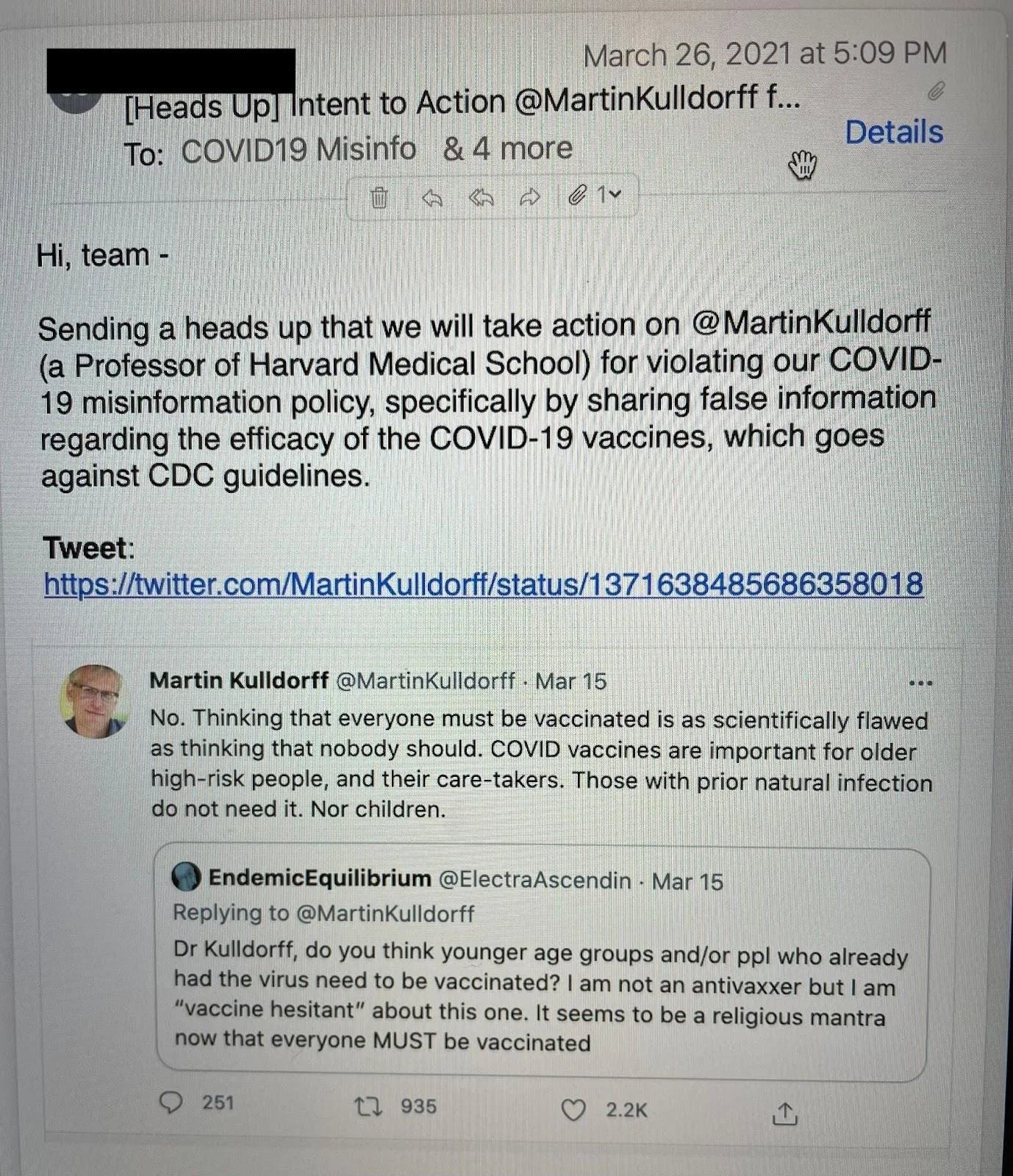 Internal emails show an “intent to action” by a Twitter moderator, saying Kulldorff’s tweet violated the company’s Covid-19 misinformation policy, and claimed he shared “false information.”