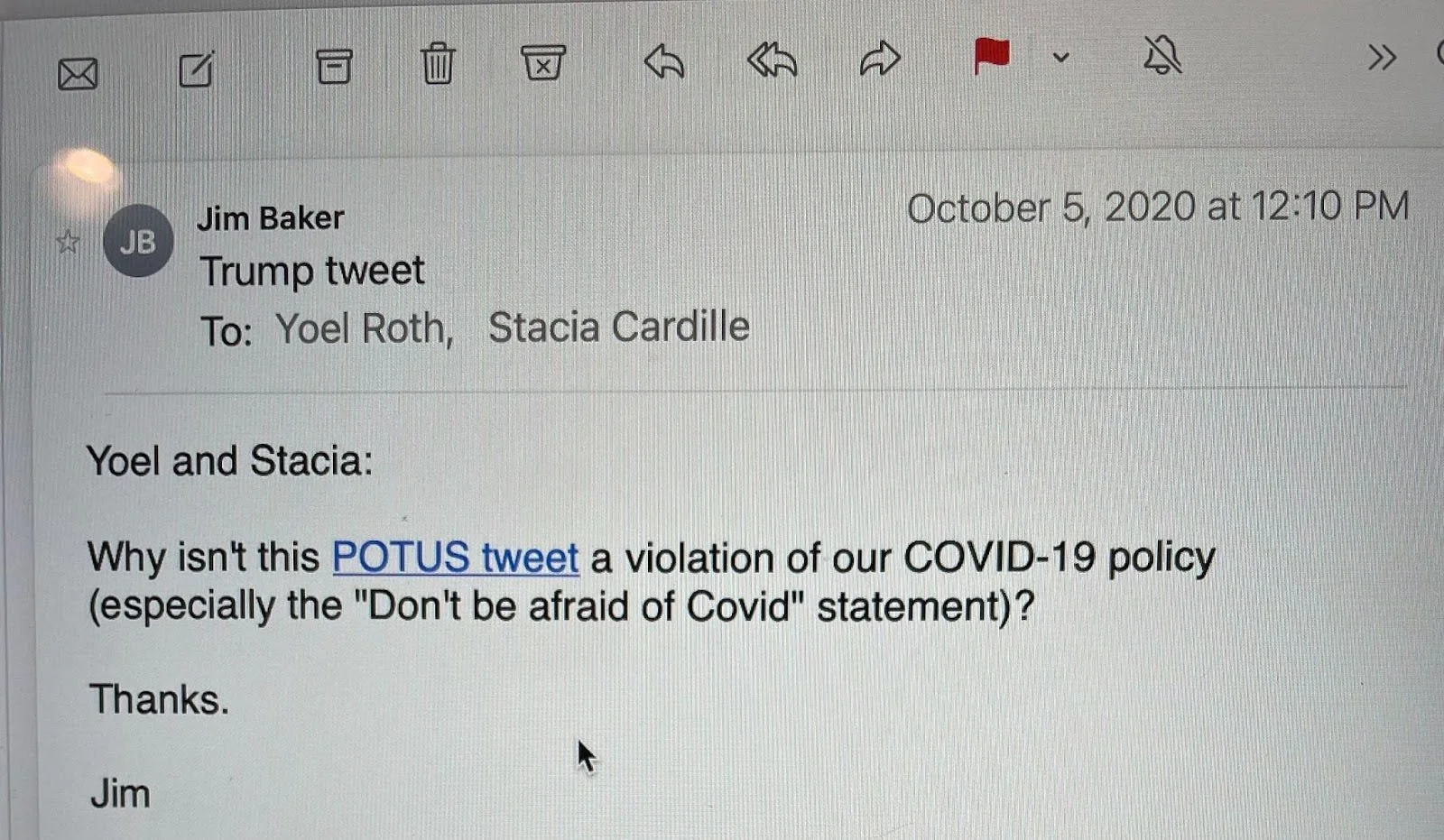 In a surreal exchange, Jim Baker, at the time Twitter’s Deputy General Counsel, asks why telling people to not be afraid wasn’t a violation of Twitter’s Covid-19 misinformation policy.