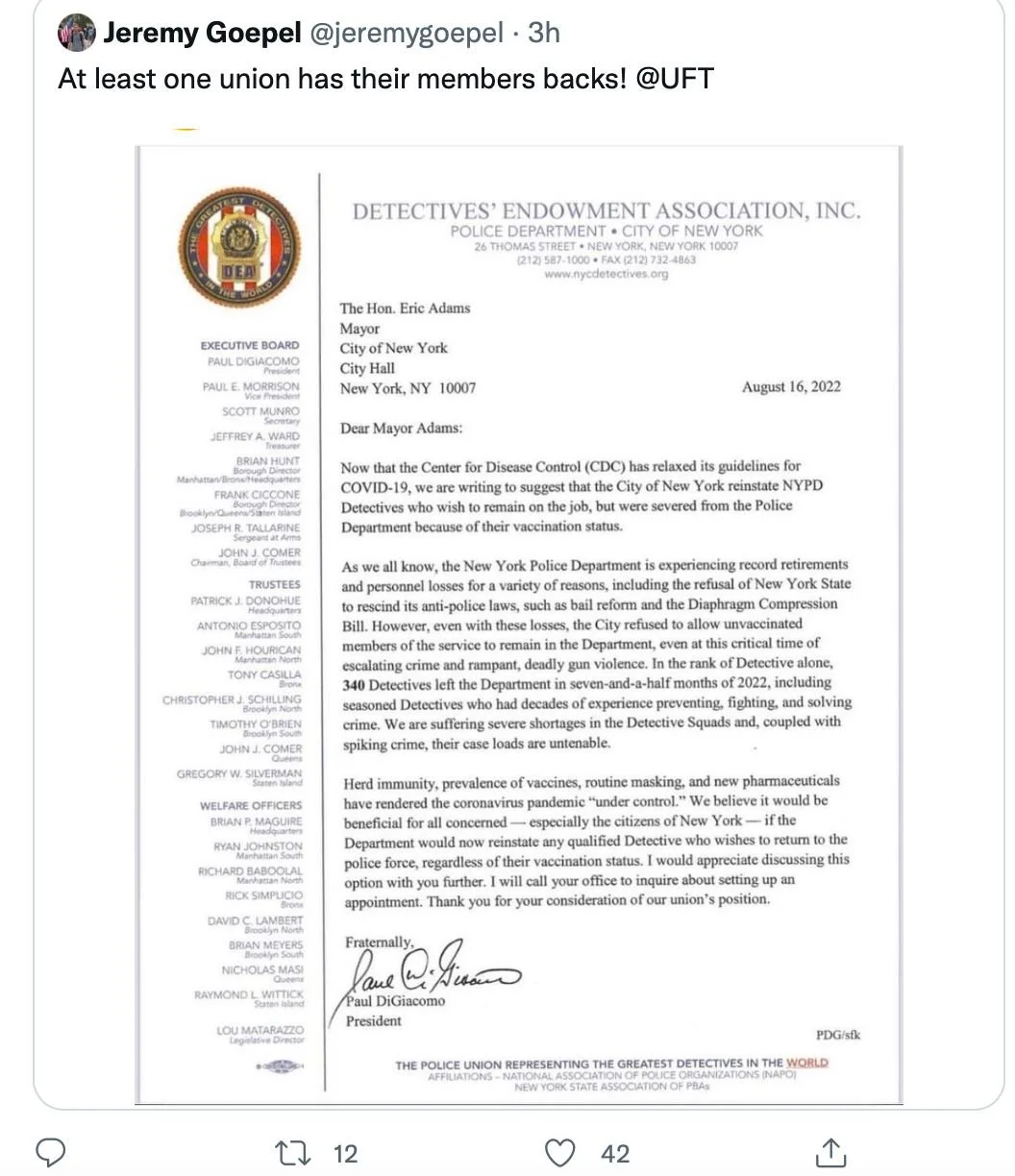 Paul DiGiacomo, president of the Detectives’ Endowment Association, Inc., writes to NYC Mayor Eric Adams with a request to reinstate detectives, regardless of their vaccination status.